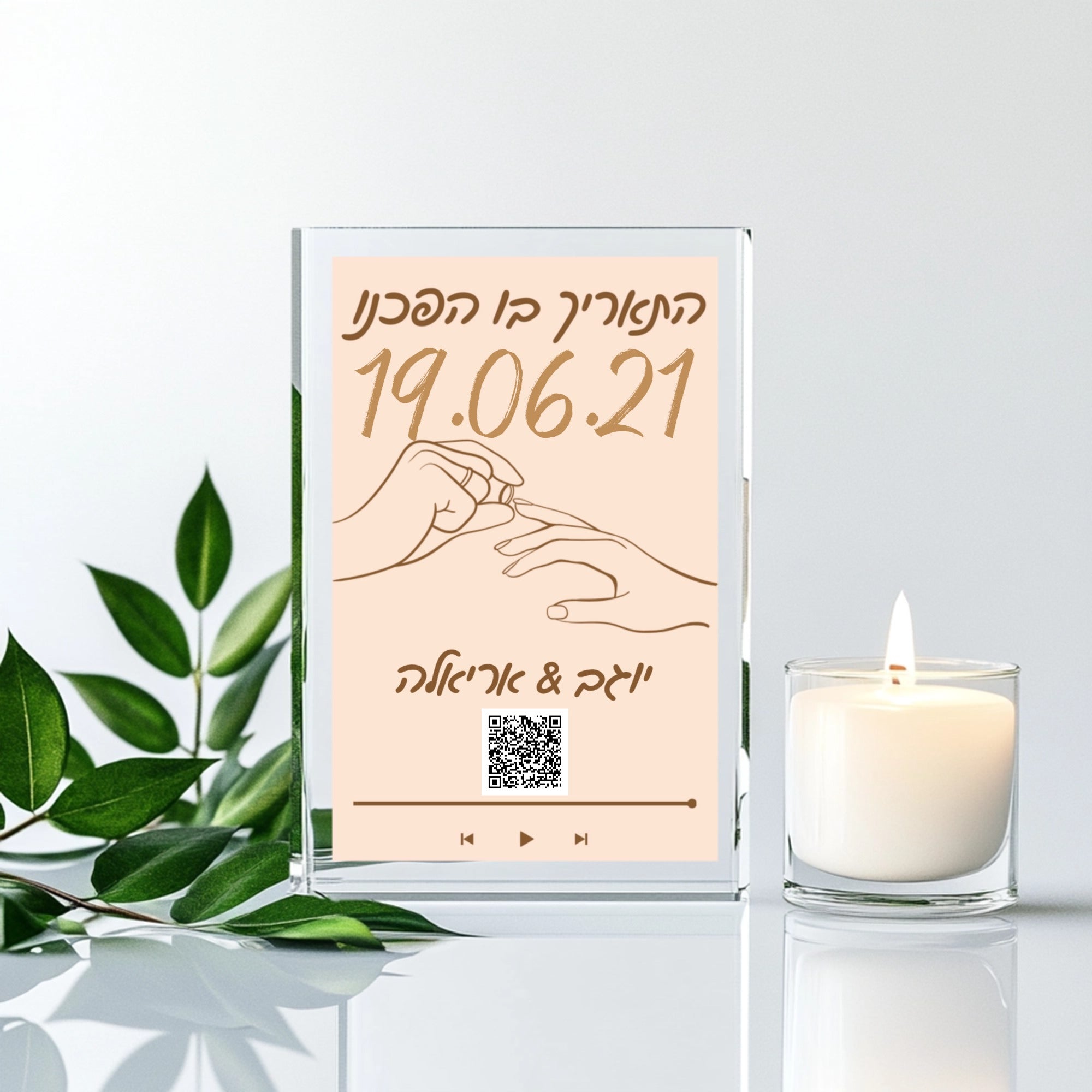 חומר: אקריל שקוף, עמיד ואיכותי. הדפסה חדה בצבע מלא. אפשרות להוספת תאריך אישי, שמות, ואיור מותאם. סריקת QR לקישור ייחודי (שיר אהבה, סרטון אישי או גלריית תמונות)