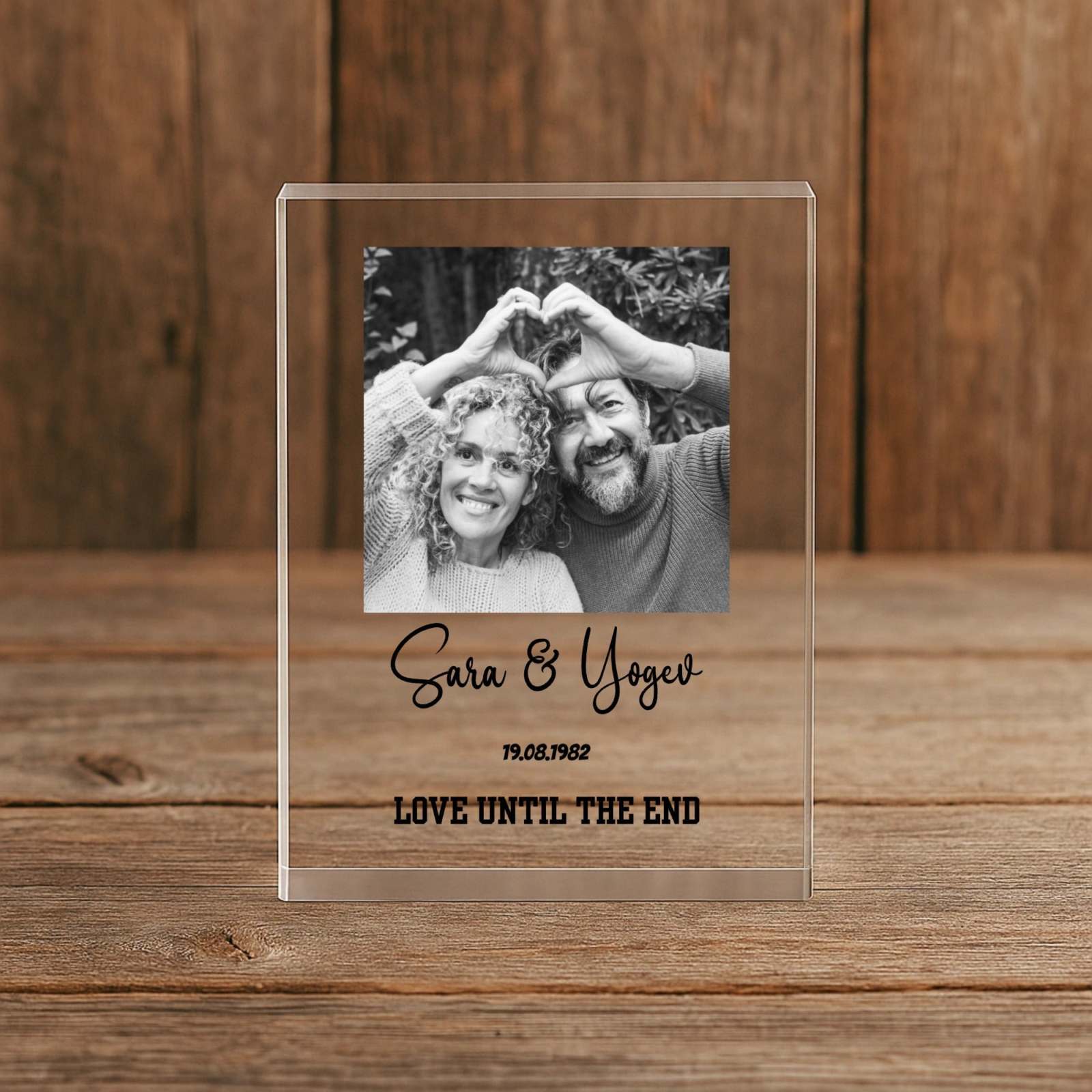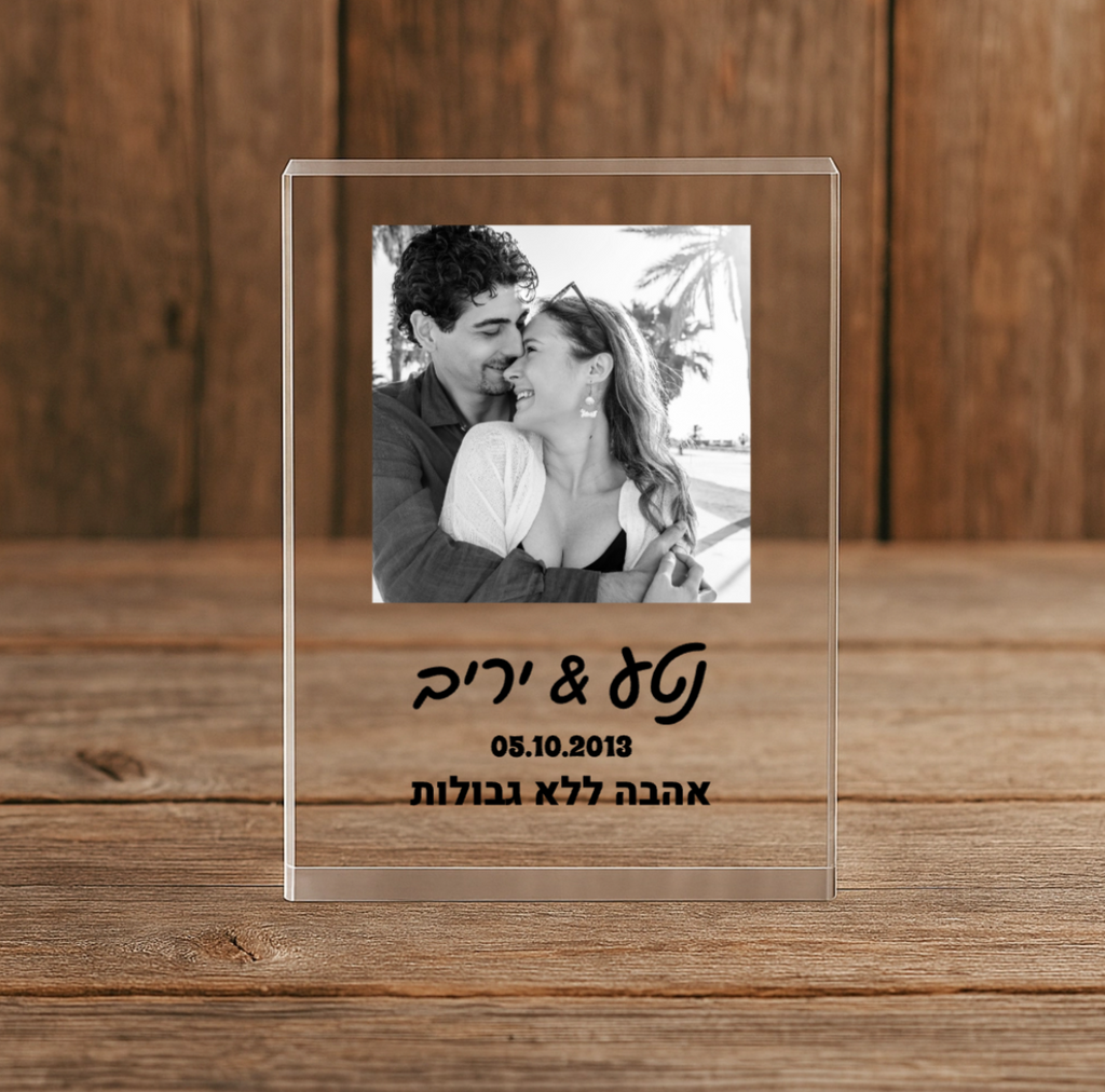 בלוק אקרילי מעוצב בהתאמה אישית – מתנה יוקרתית ומרגשת שתישאר לנצח. מעלים תמונה, מוסיפים שמות, תאריך ומשפט אהבה – והבלוק מודפס בהדפסה איכותית על גבי אקריל שקוף בעובי מרשים.