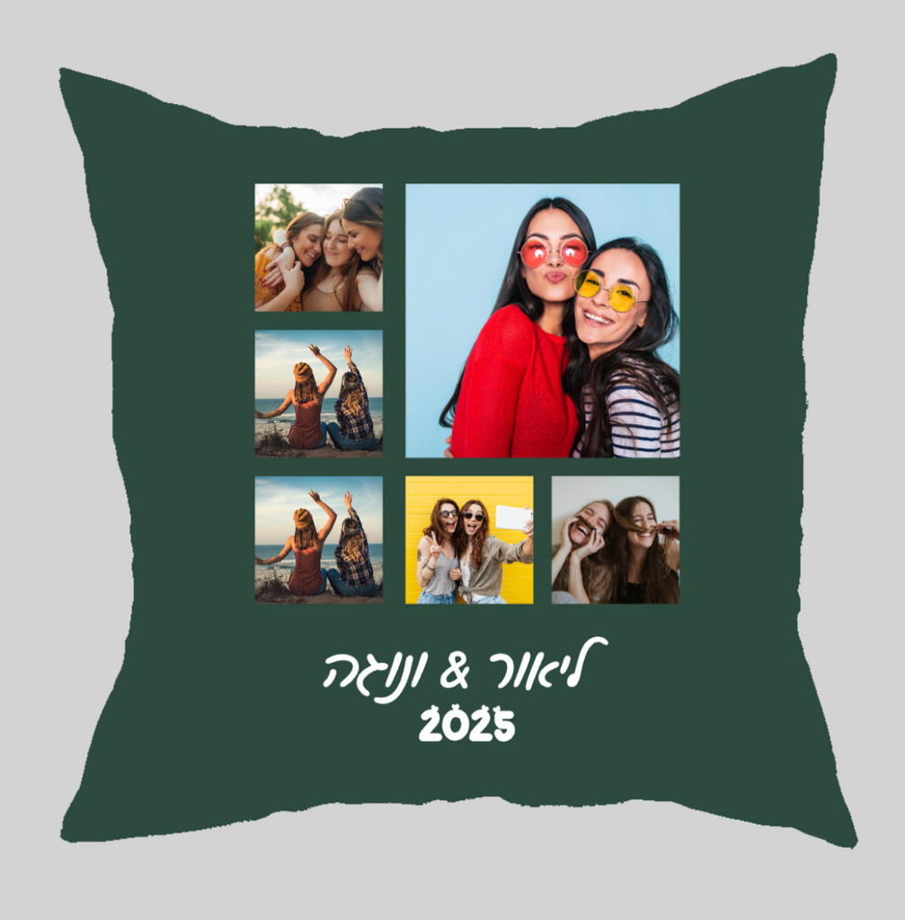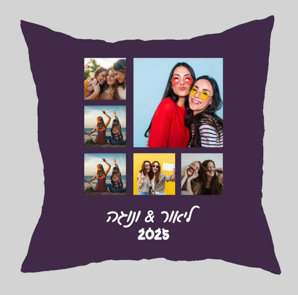כרית נוי מעוצבת בהתאמה אישית עם קולאז' של 6 תמונות שתבחרו להעלות אונליין. ניתן להוסיף שם באנגלית או בעברית, לבחור את סגנון הפונט המועדף עליכם, ולהקליד תאריך מיוחד שיתווסף לעיצוב. מושלם כמתנה לחברה טובה, יום הולדת או כל רגע שתרצו להנציח. מודפס באיכות גבוהה על בד נעים למגע, לשימוש ממושך
