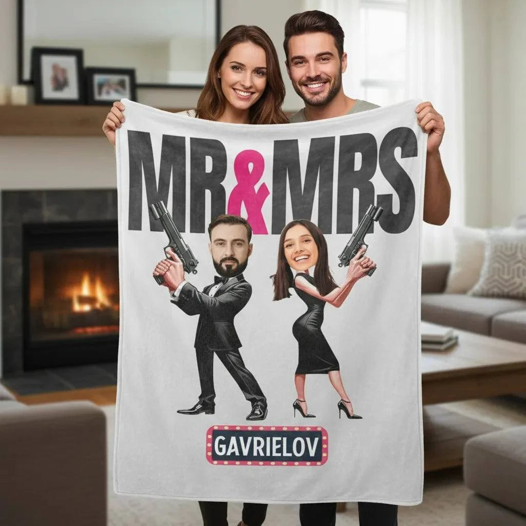שמיכה בעיצוב אישי מהסרט "מר וגברת סמית". לשמיכה 2 דמויות קריקטוריות של גבר ואישה, מעוצבות כאילו הן דמויות מהסרט, לכל אחת מהן ניתן להוסיף את פרצוף בן/בת הזוג (המערכת תתאים אוטומטית את הפרצוףֿ), ובנוסף גל להוסיף את שם המשפחה שלכם. כל העיצוב נראה אונליין. אז מר וגברת…. מתי אנחנו מדפיסים לכם את השמיכה? גודל השמיכה 130x160 ס״מ.