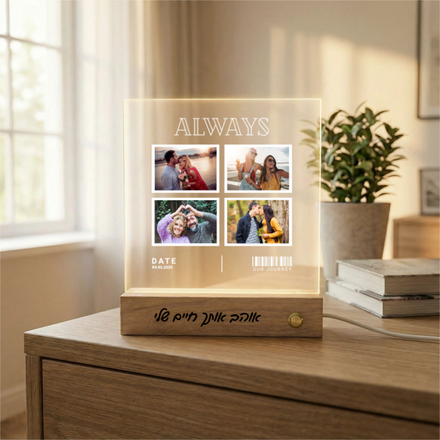 מנורת לילה אישית "Always" – קולאז' רגעים על אקריליק ובסיס עץ נטען